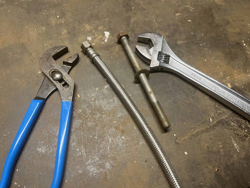 From left to right: Channellocks, faucet supply line, lag bolt, Crescent wrench
